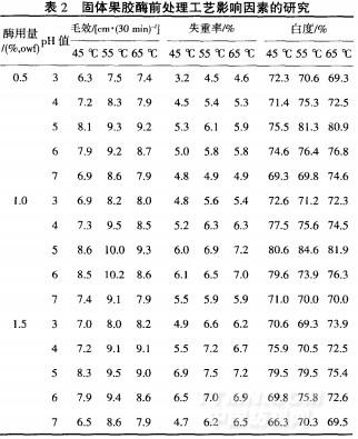 由于珍珠纤维中的珍珠主要成分是碳酸钙和各种氨基酸等.碳酸钙在近中性条件下比较稳定,各种氨基酸在近等电点附近,即在弱酸性至中性条件下比较稳定.由表1确定液体果胶的pH值为6,活性温度为65℃,最佳用量为1.O%(ow0.处理后织物的毛效为9.8 cm/30 min,失重率为5.9%,白度达82.3%.