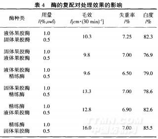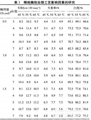 由表1~表3可看出,3种酶有相似的处理条件比如最适pH值和最适温度,但影响程度相异.综合比较精练效果,精练酶效果最好(毛效12.8 cm/30 min,白度80.1%,失重率6.9%).