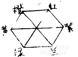 在掌握拼色原理的同时,还须掌握余色原理.所谓余色:即二种颜色有相互消减的特性。 例如一只带红光的兰色,如果认为红光太重,则可以加入一些红色的余色,印绿色染料来消减。再如:一只带绿光的兰色,如果认为绿光太重,则可以加入一些绿色的余色,即红色染料来消减。应用此方法,只能起微量调节色光的作用。如用量太多,反而会影响色泽深度和光亮 度。下面是几种颜色的余色关系图:每根对角线两端的颜色就称为余色。