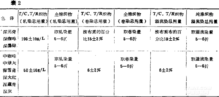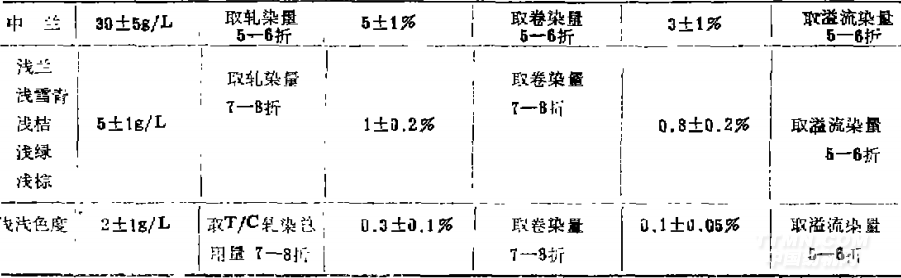 F.争取“一色多法”,而不要“一 色单法 ”(要从染色方法考虑)。T/C细布染浅湖兰,用分散兰与分散红拼出,既能用高温高压溢流法染色,又能用载体法染色,也能用轧染法染色。