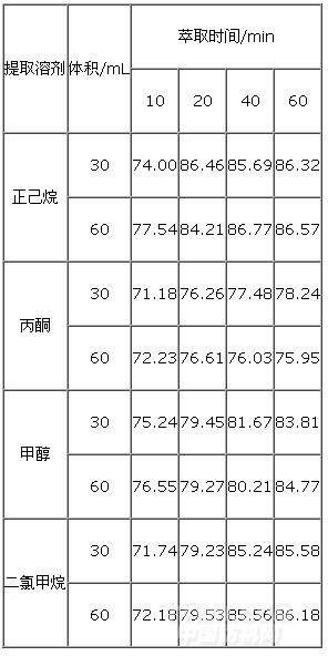 从表1可以得到,在不同时间内用提取溶剂为正己烷、丙酮、甲醇和二氯甲烷对短链氯化石蜡进行提取,当提取溶剂体积在30mL时回收率的范围分别在65.13%~80.38%、63.13%~81.79%、56.71%~79.90%和61.78%~73.36%,当提取溶剂在60mL时回收率的范围分别在66.53%~81.52%、65.50%~82.66%、60.41%~78.66%和61.51%~75.61%在回收率的总体趋势是随着提取溶剂的体积的增加,液液萃取的时间的增长其回收率逐渐增加。
