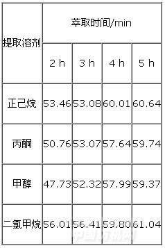 (3)方法三(索式萃取): 准确秤取(1.0±0.01)g的标准涤纶贴衬布样,加入1 mL浓度20 ppmC10-C13的标准溶液(hexane溶解),静置10 min使溶剂正己烷挥发,用滤纸包成桶装,放入提取器中,加入100 mL的提取溶剂,用不同的时间进行索式萃取,萃取结束后用旋转蒸发至近干,再用缓慢的N2吹干,用色谱级的正己烷定容至1 mL,用0.22 um滤膜过滤上GC-MSD进行测试。平行测试三个样品,其平均回收率如表3所示。
