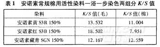 分别采用安诺素棉用活性染料三原色黄S3R150%、红S3B 150%和藏青SGN 150%进行棉/丝光羊毛纤维的染色,染色结果见表1。