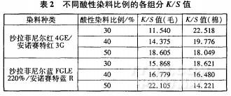 采用沙拉菲尼尔红4GE/安诺赛特红3C和沙拉菲尼尔蓝FGLE 220%/安诺赛特蓝R一浴法工艺,通过改变直接与酸性染料的比例,以获得两组分相同得色深度的效果。酸性染料占染料总量的比例分别为30%、40%和50%,防染剂FRN质量分数为2%。染色结果见表2。