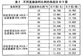采用亨斯迈公司的沙拉菲尼尔直接染料黄ARL154%、红4GE和蓝FGLE 220%分别与安诺其公司对应的安诺素活性染料黄S3R 150%、红S3B 150%和藏青SGN 150%拼色,并添加2%羊毛防染剂FRN,防止直接染料对羊毛的沾污。其中,直接染料所占比例分别为10%、20%、30%和40%。表3为不同色系染料按此混合比例染色获得的混纺纱线两组分K/S值。