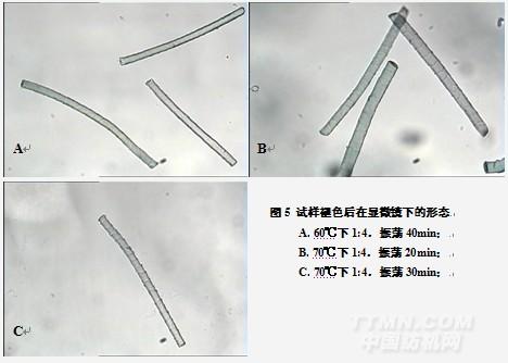 结果表明,当试样与保险粉之比为1:0.5时,即使振荡温度达到80℃,时间延长至40min,效果仍然不理想,纤维色泽较深,难以辨认(图4A)。