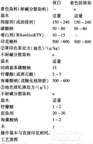 工艺流程易拔分散染料染地色一印花(拔白浆或着色拔染浆)一烘干一汽蒸固着(13O℃,3Omin或17O~180℃,7—1Omin)一冷水淋洗一热水洗(或还原清洗)一水洗一烘干