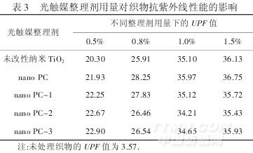 由表3可知,随着整理剂用量增加,抗紫外线能力提高;1.0%后,抗紫外线能力(UPF值)可超过35,比未处理织物提高了8倍多.