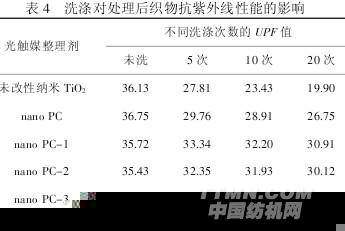 由表4可知,未改性纳米TiO2处理的织物洗涤后,其抗紫外线能力显著下降,且洗涤次数越多,下降幅度越大.而经过nanoPC系列光触媒整理剂处理的织物,尤其是与交联剂复合的整理剂(如nanoPC-1、nanoPC-2和nanoPC-3),由于其与纤维发生了共价键的接枝或交联反应,提高了纤维与整理剂的结合牢度[10],