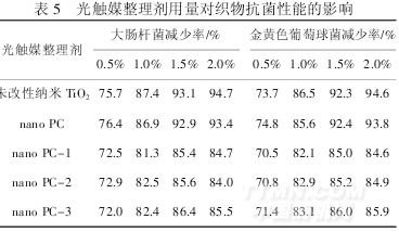 由表5可知,经纳米TiO2和光触媒整理剂nanoPC、nanoPC-1、nanoPC-2和nanoPC-3处理的织物都具有较好的抗菌性能,并且随着整理剂用量增加,抗菌效果也提高.原因是纳米TiO2发生光触媒反应时,产生了氧化能力极强的活性氧和氢氧自由基,能攻击细菌的外层细胞,穿透细胞膜,破坏细菌的内部结构,并彻底杀灭细菌.[11]