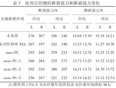 由表7可以看出,未经紫外线照射的各类纳米整理剂处理后的织物,在短时间内的断裂强力和撕破强力与未经整理的织物比较,部分稍有下降或提高,但变化不大.而不同纳米光触媒整理剂整理后的织物经紫外线照射一段时间后,则出现很大的差异:未改性的纳米TiO2处理后的织物,经紫外线照射48h后,其断裂强力和撕破强力的下降幅度大于nanoPC系列纳米光触媒整理剂处理后的织物;而用nanoPC系列纳米光触媒整理剂处理后的织物,经紫外线照射后,其断裂强力和撕破强力的下降差值低于用未改性的纳米TiO2处理的织物.原因是改性纳米TiO2表面存在的硅氧键等基团,可以隔离纳米TiO2与纤维的直接接触,对纤维有一定的保护作用,利用本文开发的系列改性纳米TiO2光触媒剂使TiO2对纤维的光氧化作用降低,可以避免或降低纤维的劣化现象.