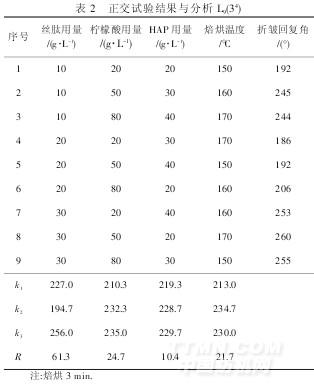 综合折皱回复角、白度、撕破强力各项指标认为,丝肽/柠檬酸体系最适于作为丝绸的抗皱整理剂,故设计正交试验,优选丝肽/柠檬酸整理柞蚕丝绸的最佳工艺参数.