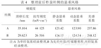 由表4 可知,先经丝肽/柠檬酸整理,再经氨基硅油整理后的柞蚕丝织物更加柔软,悬垂风格得到进一步改善.
