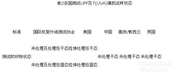 各国评价纺织品抗紫外性能的标准中,另一个明显的不同是测试防护系数和透射率时的织物状态。在EN13758-1标准中特别指出:拉伸以及湿态状态下会降低纺织品防紫外性能。
