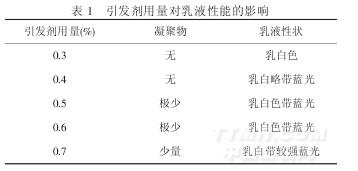 乳化剂的种类和用量是决定乳液聚合、乳液储存稳定性和乳液最终性能的关键因素.阴离子乳化剂的乳化能力较强,其离子特性更易分散于水中,因而乳液粒径小,但耐电解质稳定性差.非离子乳化剂对pH变化不敏感,比较稳定,但是乳化能力不及阴离子乳化剂,聚合过程中易生成凝聚物.将阴离子和非离子乳化剂复配使用,比单用其中一种的乳化效果要好.在本文中阴离子乳化剂选用十二烷基硫酸钠,非离子乳化剂使用Span80.乳化剂用量占单体总质量的4%,其中十二烷基硫酸钠和Span80 的质量比为1∶3 时乳化效果较好.