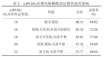 由表2 可知,当w(PCDL)=18%时,膜的软硬程度最佳,不发粘,且光亮度较为理想.可能原因是光亮型聚丙烯酸酯中的聚碳酸酯二元醇分子结构规整,成膜时易产生定向结晶,且膜平整光滑,故光亮、机械性能都较好.[5].