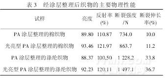 (2)经光亮型聚丙烯酸酯涂层整理过的棉和涤纶织物的亮度和反射率都有了一定程度的提高,与普通的聚丙烯酸酯膜相比,光亮型聚丙烯酸酯膜的力学性能有所改善.