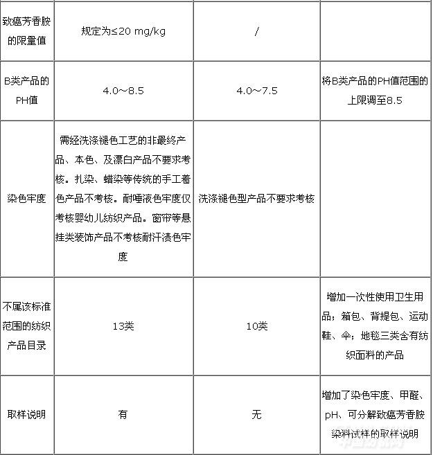 GB 18401—2003《国家纺织产品基本安全技术规范》(以下简称老标准)的实施为我国纺织产品的生产、销售、使用和监督提供了统一的技术依据,对于有效保护我国纺织消费者的健康,规范市场以及提高我国纺织行业的整体水平和国际竞争力发挥了重要作用。将于2011年8月1日实施的GB 18401-2010《国家纺织产品基本安全技术规范》(以下简称新标准)相比于老标准,无论是指标要求还测试方法,都有一些新的变化。条款规定更清楚,可操作性更强,对纺织品企业在生产和销售等环节都提出了更加严格的要求。认真贯彻落实新标准将更有效的保护我国消费者健康,引导纺织品生产销售企业注重产品质量,有助于提升我国企业市场竞争力和积极应对国外技术性贸易壁垒。为了更好的贯彻落实新的标准,本文将新老标准作对比,详细介绍新增的考核内容和要求,并对重要考核指标进行解读。