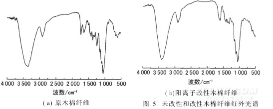 分子间氢键越强,—OH峰向低波数方向移动;反之,—OH峰则向高波数方向移动。图5(b)中,阳离子改性木棉纤维—OH的伸缩振动吸收峰在3 417 cm-1处,与原木棉纤维相比,—OH峰向高波数方向移动,可见阳离子改性木棉纤维分子间氢键减弱。这可能是由于阳离子改性剂与纤维素发生反应,生成新的—OH基团,故还存在—OH的伸缩振动吸收峰,但是削弱了纤维素分子间氢键的作用,致使—OH峰向高波数方向移动。