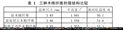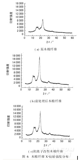 图6(a)、(b)和(c)分别是原木棉纤维、经前处理和8% (owf)阳离子改性剂SA于75℃处理45 min后的木棉纤维的X射线衍射强度分布。表1为在2θ=23°处衍射峰的半高宽及计算得到的纤维晶粒粒径和结晶度的对比。