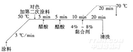 加入涂料后以2~3℃/min速率升温至50℃,运行20 min,若升温速率过快则易于染花。黏合剂在50℃温度下应用能减少对设备的沾污,温度高于85℃应用时会形成难去除的沉积。若加入并运行20 min时涂料未能吸尽,则需加入黏合剂并升温至70℃运行20 min。