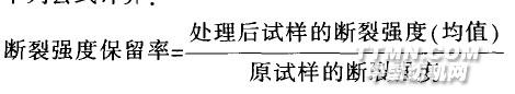 Wo---织物原试样质量;W1--- 处理后织物试样质量(2)断裂强度保留率测定:距织物边10 cm以上处取样。扯去边纱,测试5次取算术平均值,结果按下列公式计算: