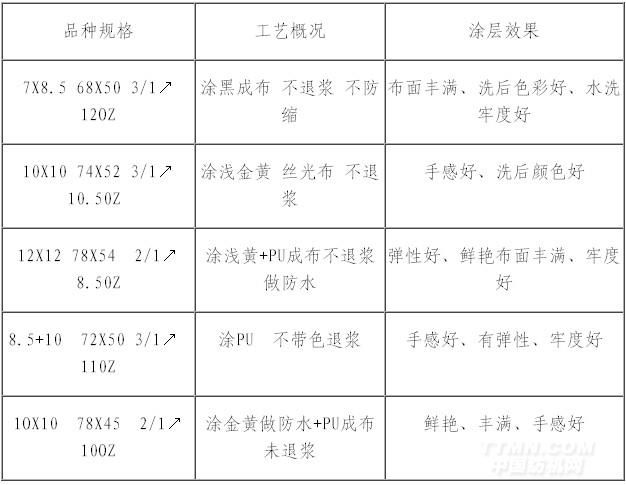 按照上述的工艺流程,对不同品种牛仔布涂层后的效果概括如下: