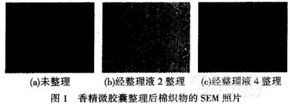 由图1可知,未整理的棉织物表面较为光滑.经微胶囊整理后织物表面形成了一层均匀致密的有机粘合剂一微胶囊高分子膜,粘合剂和微胶囊微粒深人交织点间,织物结构变得较为紧密,其中,粘合剂PU-1比粘合剂JJS成膜性优良,膜结构更加致密.