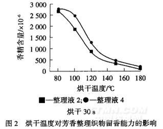 干温度的不断升高,未被包覆的香精很快挥发干净,接下来主要是被包覆在微胶囊内的茉莉香精的挥发-由于壁材的保护作用,其挥发速度较慢[2],到150℃时,织物上仍有少量的香精,这说明本试验所开发的香味织物具有一定的耐热性.用聚氨酯类粘合剂整理过的香味织物其耐热性明显优于聚丙烯酸酯类粘合剂.从粘合剂的使用条件和芳香织物上香精保留量考虑,选择整理后芳香织物的烘干温度为80℃.