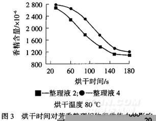 从图3可知,随着烘干时间的延长,芳香整理织物的香精含量均逐渐减少.在烘干的前120s试样上香精的减少速度较快,另外,本文所开发的香味整理织物在80℃时可经受180s的烘干,且经聚氨酯类粘合剂整理过的芳香织物其耐热的持久性更好.从粘合剂使用条件和芳香织物上香精保留率考虑,选择整理后芳香织物的烘干时间为30s.