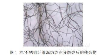 由图可见,纱线经充分燃烧后,棉组分被去除,剩余不锈钢纤维,因此可采用燃烧法来测定棉/不锈钢纤维混纺防辐射面料的成分含量。