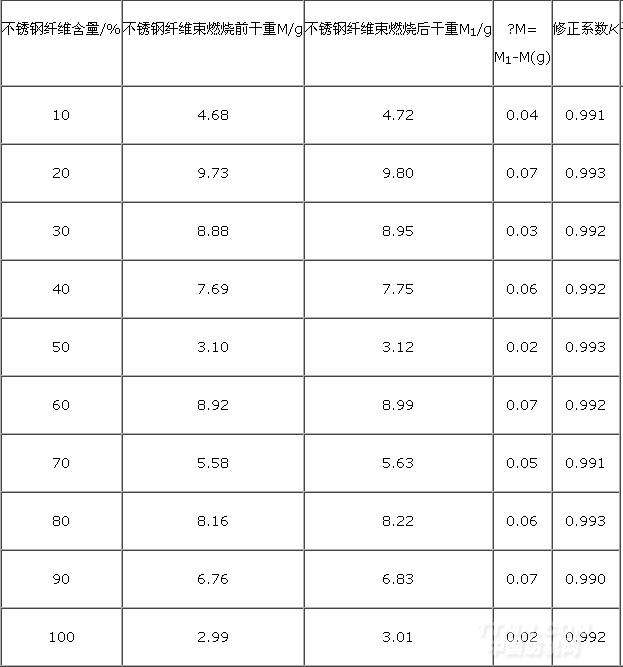3) 按公式(1)计算不锈钢纤维的质量修正系数K;