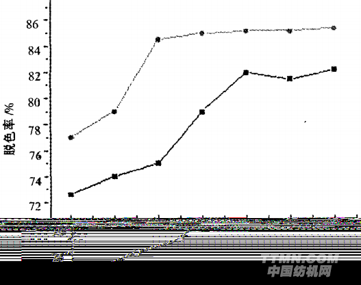 由图2可以看出,当投加量为8O mg/100 mL时,泥炭对活性嫩黄K-6G的脱色率可达82 ,加大投加量,脱色效率提高不明显。对于此种染料液,最佳投加量为8O mg/100 mL。对活性深蓝K—R,最佳投加量为60 mg/100 mL,脱色率达85 。