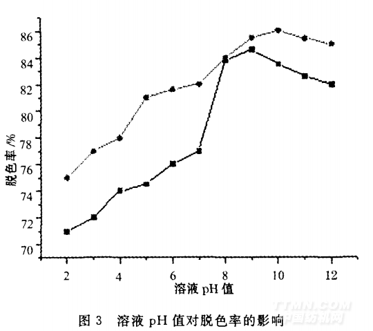 用HCI和NaOH溶液调节活性深蓝K—R、活性嫩黄K一6G染料溶液的pH值为8~12,泥炭投加量分别为60 mg/100 mL和80 mg/100 mL,25℃恒温振荡吸附3O rain,考察溶液pH值对脱色率的影响,结果见图3。由图3可以看出,随着溶液pH值的增大,脱色率呈现出先升后降的趋势。对活性深蓝K—R,当溶液pH值为5~12时,脱色率较高,均在8O 以上;对活性嫩黄K一6G,当溶液pH值为8~11时,脱色率在80 以上。由此可见泥炭适应的印染废水pH值范围较宽。泥炭对活性深蓝K—R和活性嫩黄K~6G染料溶液吸附脱色的最佳pH值分别为1O和9,此时脱色率分别达到86 和84.6 。当pH值大于1 0时,脱色率均下降.此时,泥炭中的一COCH等基团与碱反应,表面正电性趋弱,对水中负电性胶粒的吸附架桥和压缩双电层的作用减弱,所以脱色效率下降。