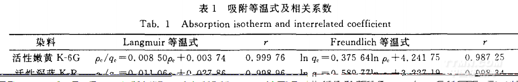 方程可表示为: qe/P e一1/(bq max。 +P e /qmax);Freundl—ich方程可表示为:inqe一InK+ … In P e。式中qmax为单层饱和吸附量;b,k,n 均为常量。 由实验数据拟合 得到的活性深蓝K—R、活性嫩黄K一6G的吸附等温式及相关系数r见表1。