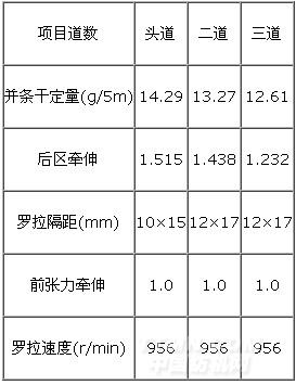 采用“轻定量、低速度、大隔距、重加压”的工艺原则。采用三道混并以使纤维得以充分混合,混一并采用4根Richcel纤维梳棉条与2根PTT和山羊绒梳棉条一起喂入,混二、混三均采用6根并合;压力适当加重,增加对纤维的控制,使握持力和牵伸力相适应,确保纤维在牵伸中稳定运动,以提高成纱条干水平;适当降低车速,并严格控制车间温湿度,可减少纤维缠绕罗拉和胶辊现象,保持各机通道光洁,无毛刺挂花。经过采取以上工艺措施,使未并条乌斯特条干CV%值达到2.8%,重量不匀率控制在0.67%。并条工序主要工艺参数见表1:
