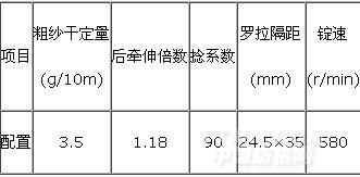 采用“低速度、大捻系数、大后区隔距、小后区牵伸、小钳口隔距、中加压”的工艺原则,以提高成纱质量。较大的细纱后区隔距和较小的后区牵伸倍数,配以较大的粗纱捻系数,使粗纱经细纱后区牵伸后,有余捻进入前牵伸区,使纤维间紧密接触,有利于皮圈对纤维运动的有效控制,因而改善成纱条干,减少毛羽。合理选择钢领、钢丝圈,减少因两者之间的磨擦而引起更多的毛羽,选用72°胶辊。车间相对湿度控制在65%以上,主要工艺参数见表3: