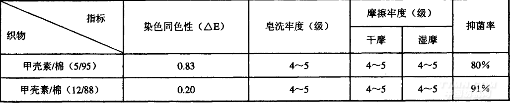 采用上述最佳改性工艺,对甲壳素,棉混纺织物进行预处理,再按2.2.4工艺进行染色、后整理。测试所得成品的染色同色性和色牢度等性能,结果如表5所示。