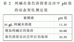 以代碱剂KL为例,用较典型的上海万得公司产的异构双活性基团的B型染料,以中浅色三原色和深浓色三原色的两组三原色进行拼色,构成从浅色,直到深浓色的8个染色试样,对其染色浴固着反应中的pH值作测定,可发现其固着浴pH值稳定范围很符合活性染料的染色特征。