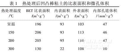 凹凸棒粘土在不同热处理温度下发生的结构、形貌、性质变化是凹凸棒粘土在材料科学领域应用研究的重要基础,如凹凸棒粘土经热处理后可作为干燥剂、生物陶粒和催化剂的载体等.天然凹凸棒粘土的比表面积约为140~210 m2/g,经高温焙烧,比表面积能够显著增加,甚至达到300 m2/g以上.在一定温度范围内,凹凸棒粘土的比表面积随着焙烧温度的升高而增加,当温度升高到一定程度,如焙烧超过600℃时,比表面积就会出现下降趋势,原因是温度过高,凹凸棒粘土失去部分结构水或羟基脱出引起孔洞塌陷、纤维束堆积,针状纤维束紧密烧结在一起,孔隙容积和比表面积减小,致使吸附能力减弱.[14]一般凹凸棒粘土活化温度不超过500℃,选择300℃左右为宜,活化时间不超过3 h.[15]Kuang[16]等研究了热处理过程中凹凸棒粘土的表面特性,其比表面积和微孔体积数据见表1.[17]