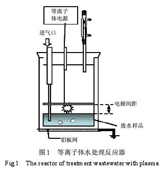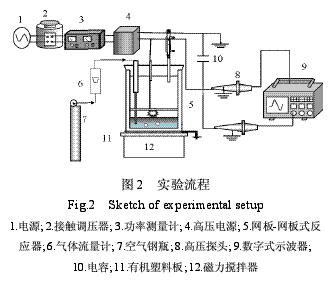 实验装置主要由高压电源和低温等离子体水处理反应器组成.反应器放置在磁力恒温搅拌器上,其间用厚度10mm有机玻璃平板隔开,防止系统漏电.反应器上部开口用硅橡胶塞密封,并预留3个开孔,分别设置进气管、出气孔和阳极连接线.一定流量的稳定压缩空气由进气管进入反应器,出口气体分布器设置在液面下.出气孔上端连接双层玻璃冷凝管,冷凝在等离子体放电过程中产生的水蒸气,并回流到反应器,以免影响水质分析结果.
