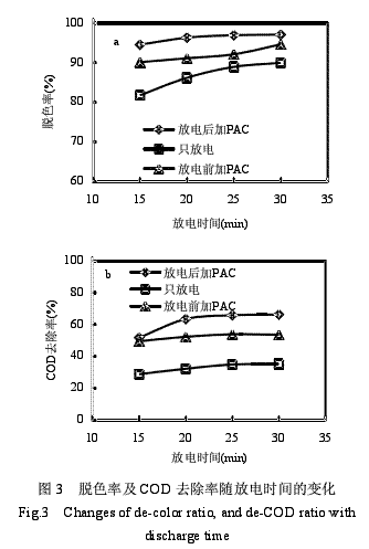 取初始浓度200mg(固体染料粉末)/L(水)(CODCr初始值572,下同)溶液50mL、放电间距8mm、空气流量16L/h,输入电压40kV,放电时间15~30min,分别在放电前、后样品中加入絮凝剂PAC(先配制成浓度20%PAC溶液,该溶液加入量为废水体积5%,下同),快速搅拌后再缓慢搅拌,静止1h分层,取上清液测试并计算不同实验条件下(废水不加絮凝剂仅放电、废水放电前加絮凝剂、废水放电后加絮凝剂)放电时间和溶液脱色率以及COD去除率关系见图3.
