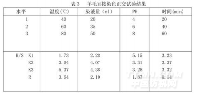 通过以上数据分析,对羊毛直接染色影响最大的是温度, 达到80 时, 上染效果最好,染液量为50m,l PH为4时染色效果最好。