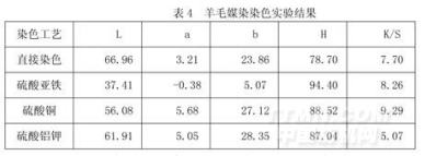 K/S值越大染色效果越好, 通过以上数据分析,K/S羊毛染色工艺媒染均能起到较好的媒染效果,硫酸铜和硫酸铝钾媒染起到了增强色深的效果。硫酸亚铁在增强色深的同时, 发生了色调的变化, a、b值逐渐降低,且a值出现负值,即由红光转为绿光。