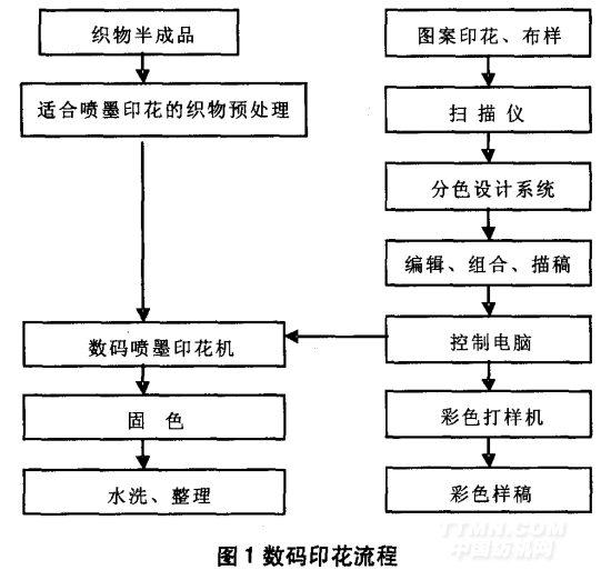 4)快速反应,零库存生产,生产过程数字化,印制效果一致,彻底改善印花生产的环境。采用数码印花技术可以很方便地设计和核对花样和图案,提供高分辨率和准确的样品,其工艺见图1。