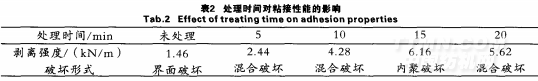 2.2处理时间对粘接性能的影响 A1 51作为偶联剂。表2给出了不同处理时间条件下芳纶布为了进一步考查处理时间对粘接性能的影响,选择 与硅橡胶的粘接强度和破坏形式。