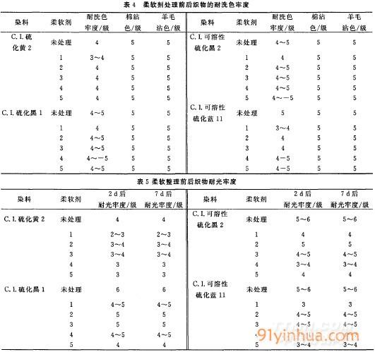 将经不同硫化染料染色的织物分别用不同柔软剂处理,处理前后的水洗牢度见表4.