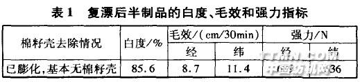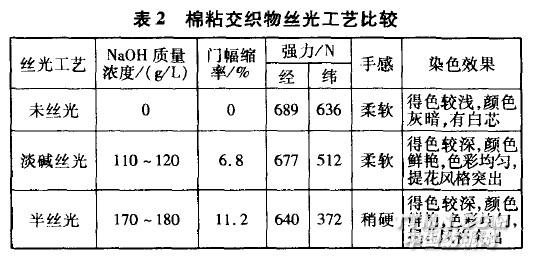由表1可知,采用平幅低张力短蒸复漂水洗工艺,基本解决了棉粘提花交织物在染整加工中易折皱和强力受损等问题。半制品的白度和毛效均符合染色要求。1.3 丝光棉粘交织物经面为棉的提花组织,若不丝光,棉纱的染色性能会受到影响,产生上色率低,布面光泽差,得色不鲜艳等问题。由于粘胶纤维耐碱性一般,故对不丝光、淡碱丝光和半丝光三种工艺进行了对比试验,结果见表2。