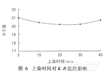 在染色温度为40℃,其它条件不变的情况下,改变上染时间,测得织物的K/S值见图6。