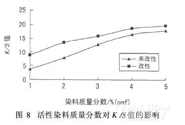 将改性及未改性的织物用活性黑RWN进行染色,碱剂Na2CO3质量浓度10 g/L,染色温度40℃,上染时间5 min,染料质量分数与K/S值的关系如图8。